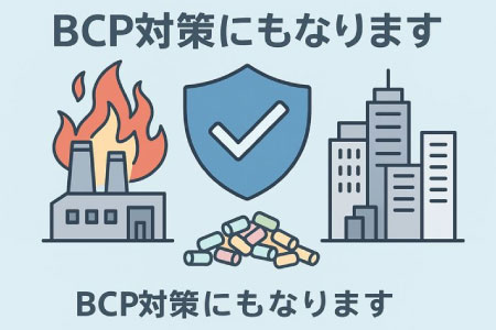 委託先の廃業・倒産、自然災害、大火災、テロ攻撃などの緊急事態時にも事業の継続に必要な『安定供給』を独自のシステムにより早期復旧を目指します。